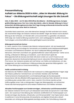 Vom 23. bis 27. Februar 2027 findet die didacta – die Bildungsmesse in Hannover statt. Dies gaben Dr. Theodor Niehaus, Präsident Didacta Verband, Dr. Hans-Joachim Prinz, Vizepräsident Messe, Dinah Korb, Geschäftsführerin Didacta Ausstellungs- und Verlagsgesellschaft mbH, Dr. Jochen Köckler, Vorstandsvorsitzender Deutsche Messe AG; Julia Willie Hamburg, Niedersächsische Kultusministerin und Belit Onay, Oberbürgermeister von Hannover bei der Vertragsunterzeichnung am 12. Mai 2025 bekannt. Die Veranstaltung wird in Zusammenarbeit mit dem niedersächsischen Kultusministerium und der Landeshauptstadt Hannover durchgeführt.